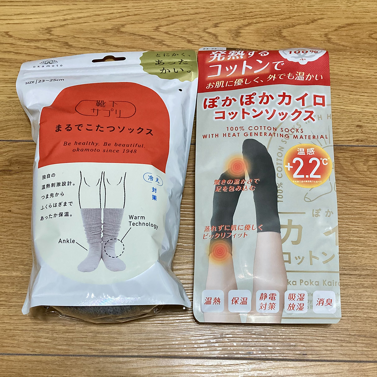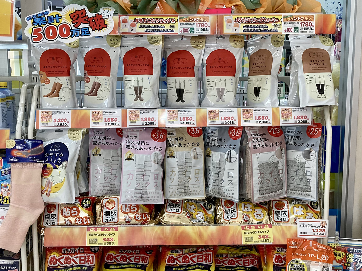 ドラッグストアで売ってる、「まるで〜」とかいう、似たような名前のあったか靴下たち…
